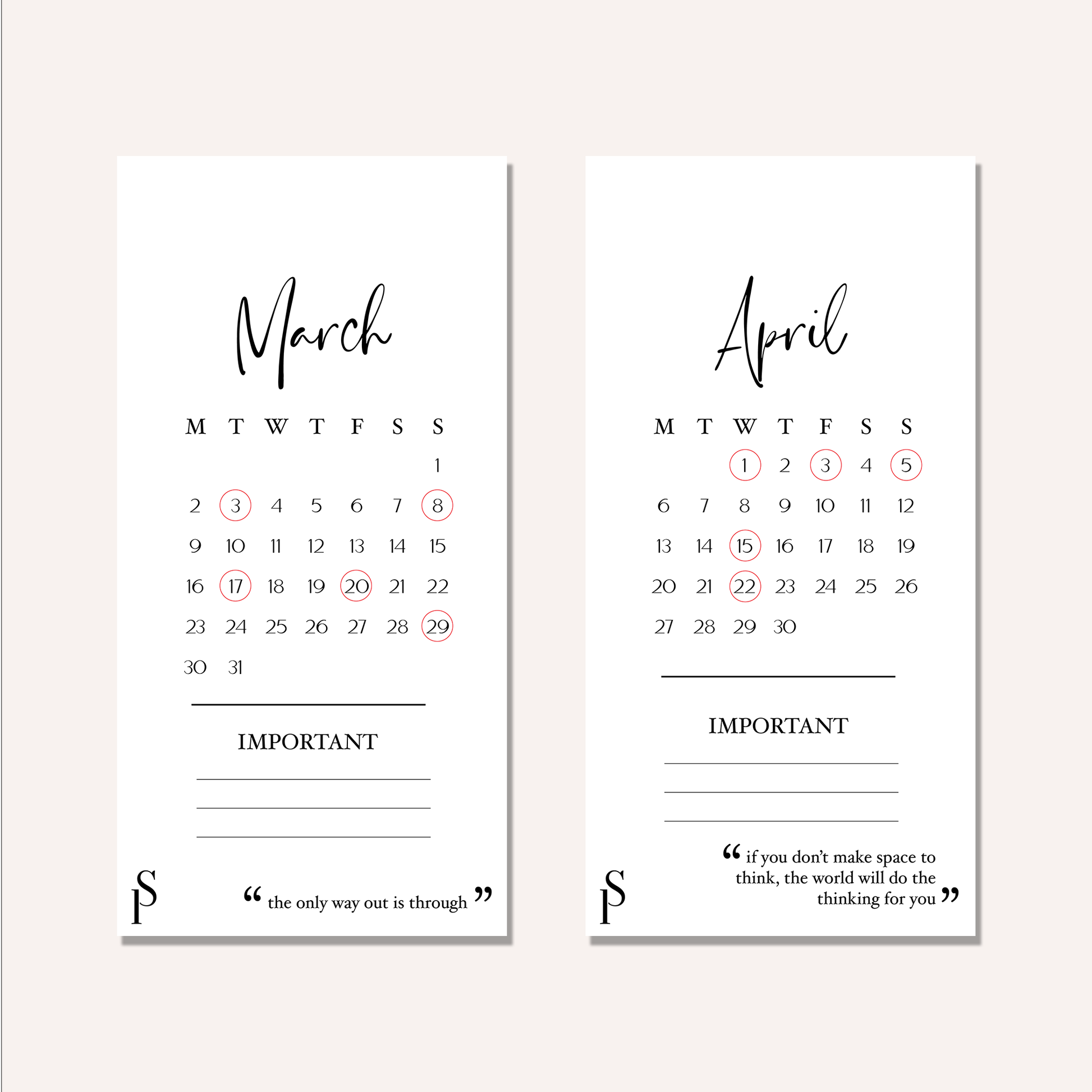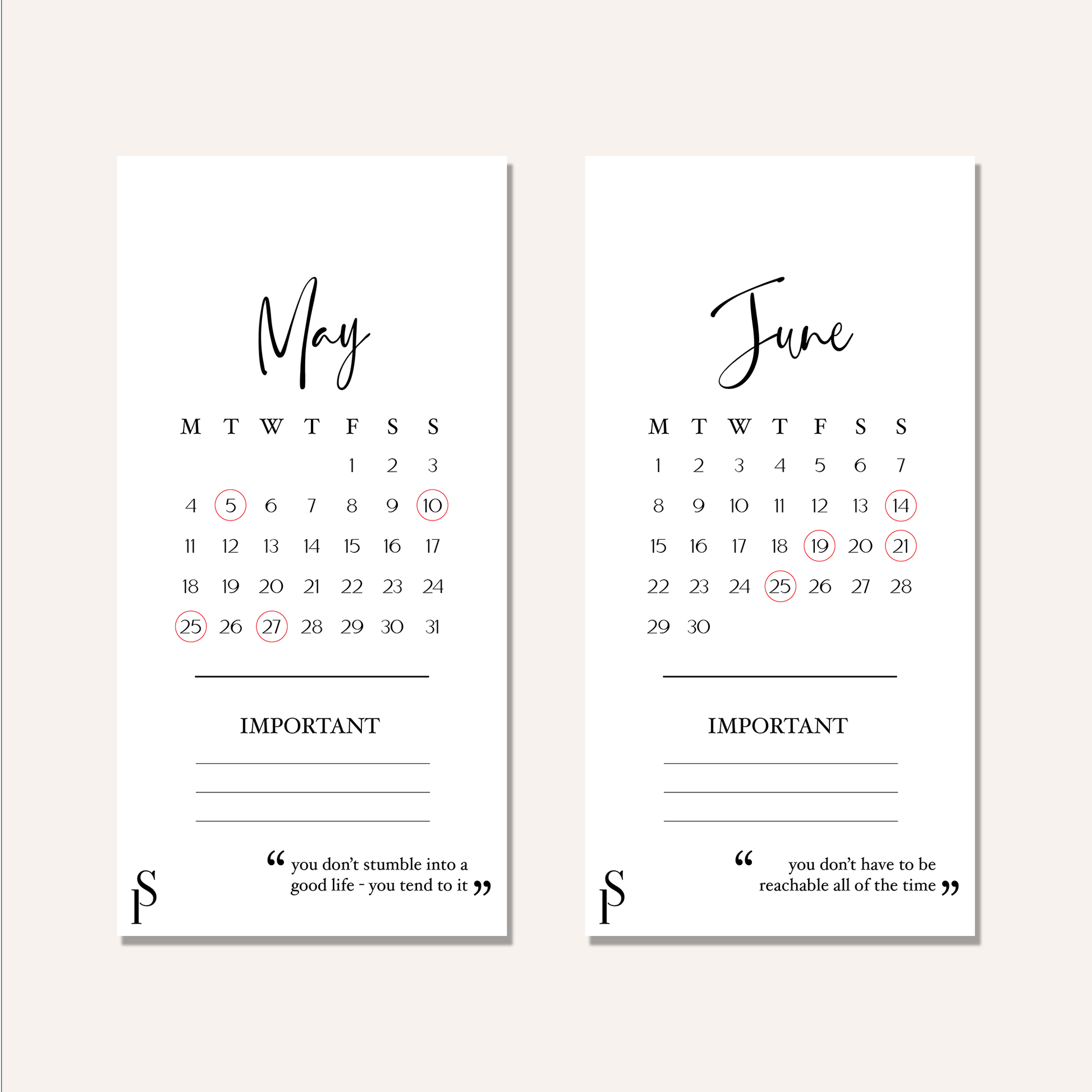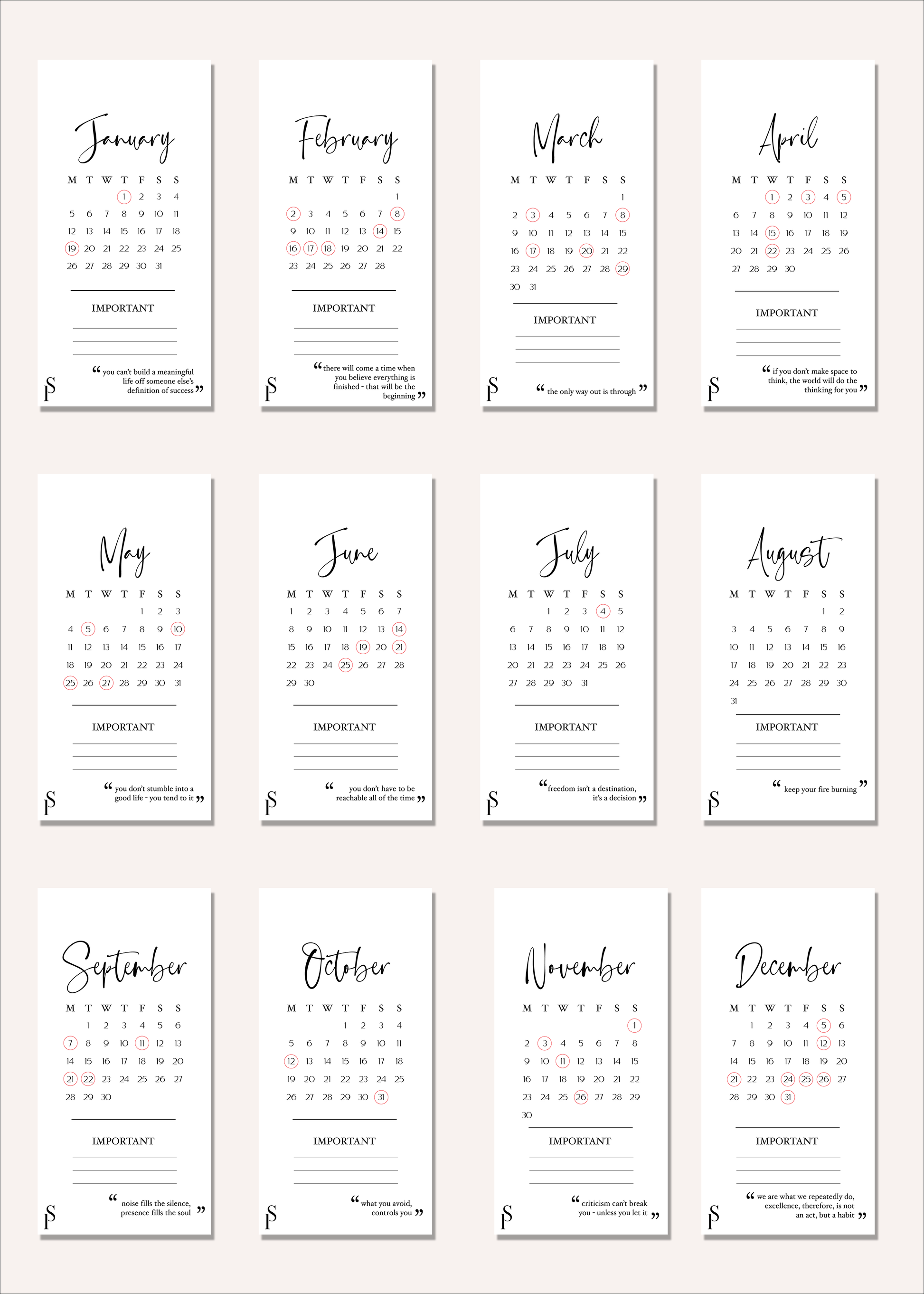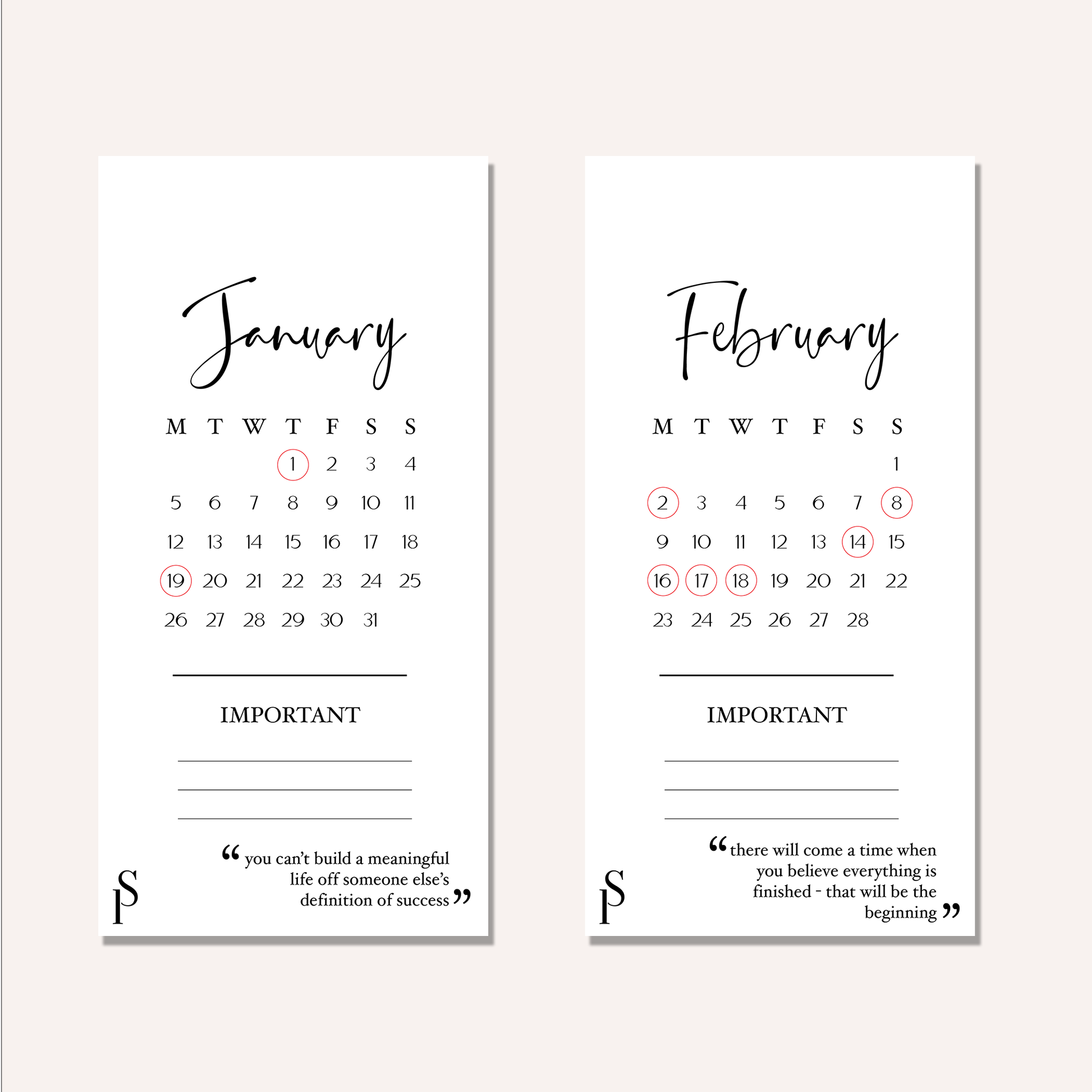 These planner pocket deco hang tags include a monthly calendar with holiday designations, an inspirational quote, and lines for you to add important information.