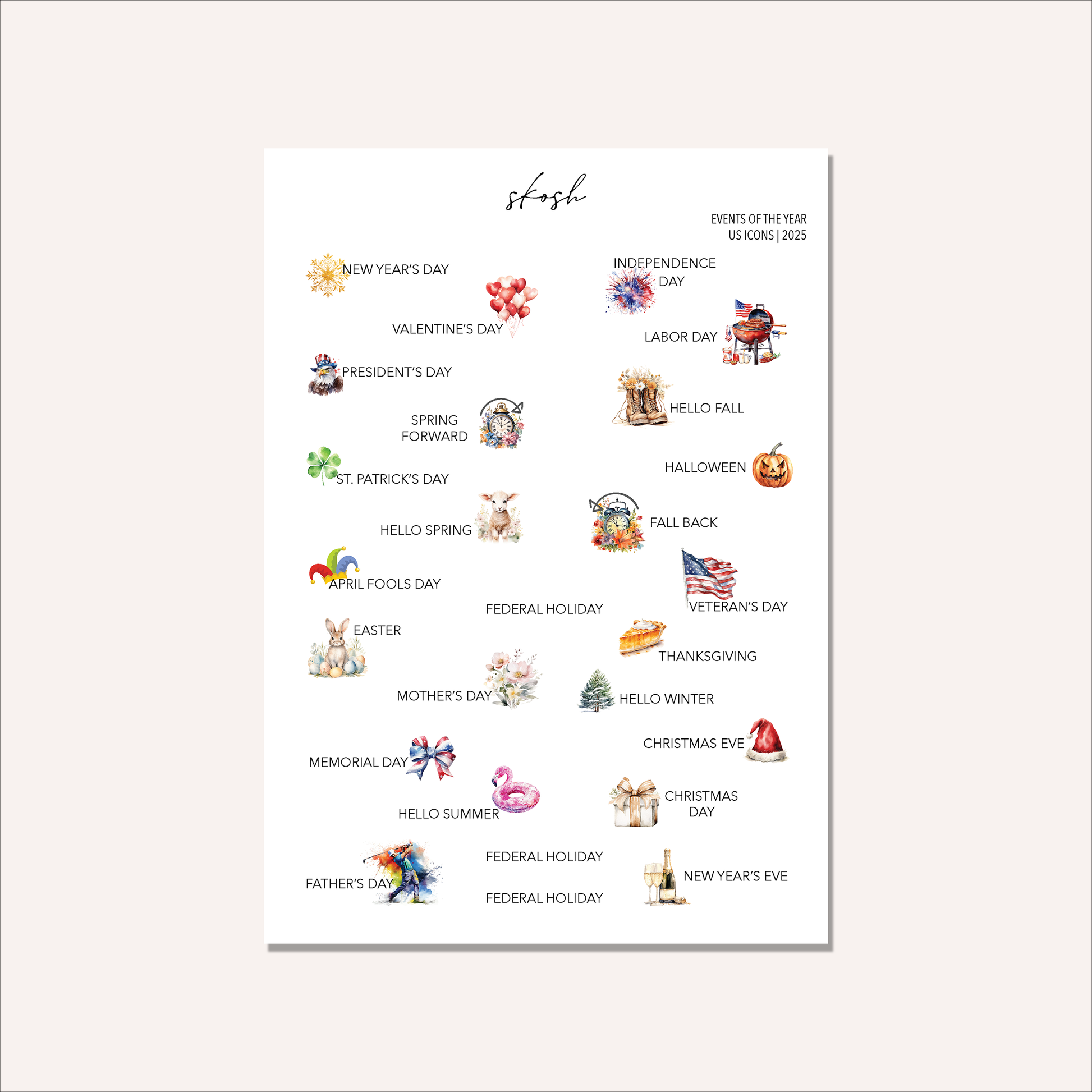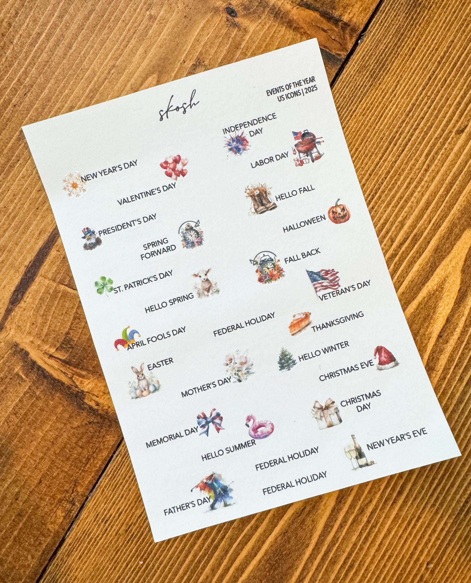 Add important dates to your planner with subtle style using these 2025 events + holidays stickers with matching icons for a clean, functional and fun look. These minimalist stickers are perfect for planners, journals, calendars, and notebooks—and are sized to fit narrower columns like those in the Sterling Ink Common Planner, Hobonichi, Hemlock & Oak, and similar 4mm grid layouts.