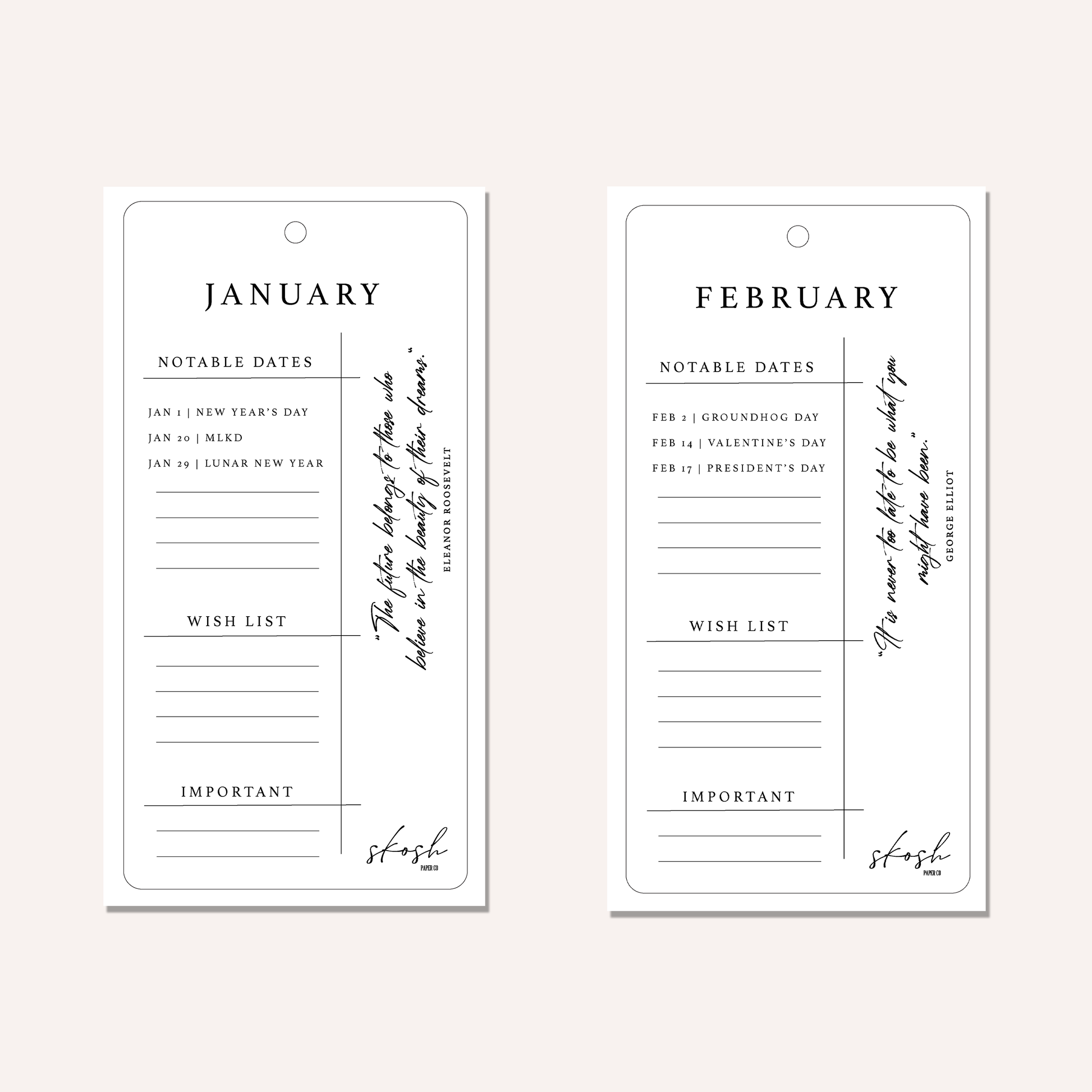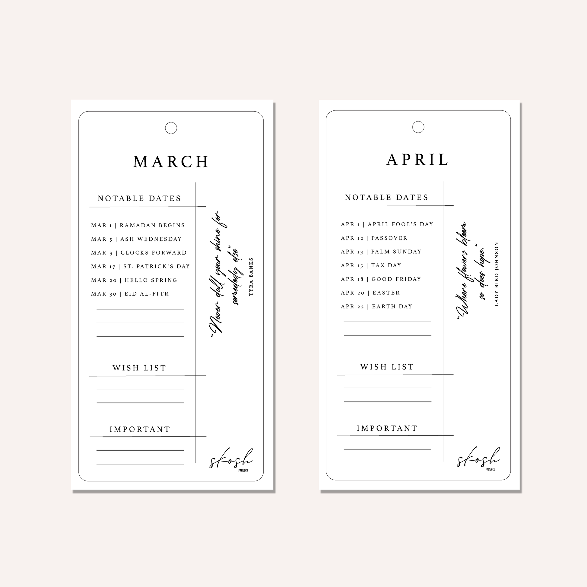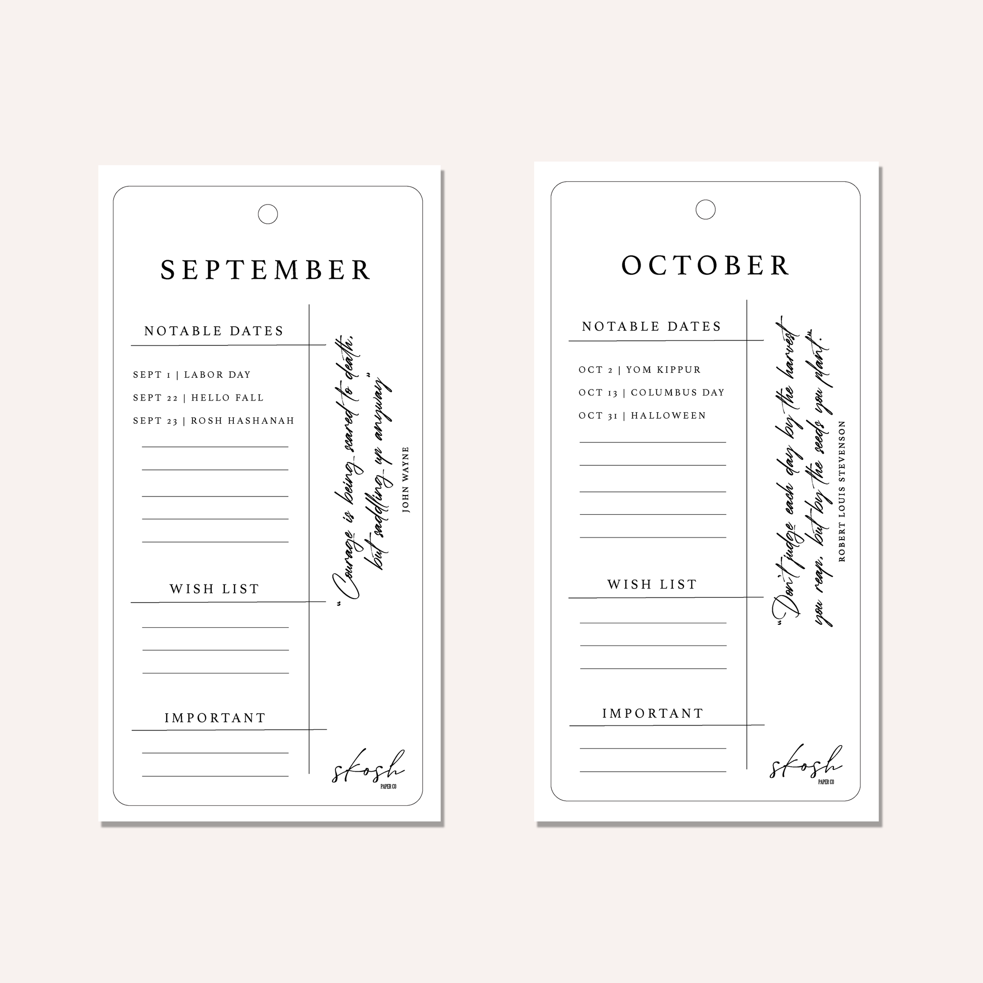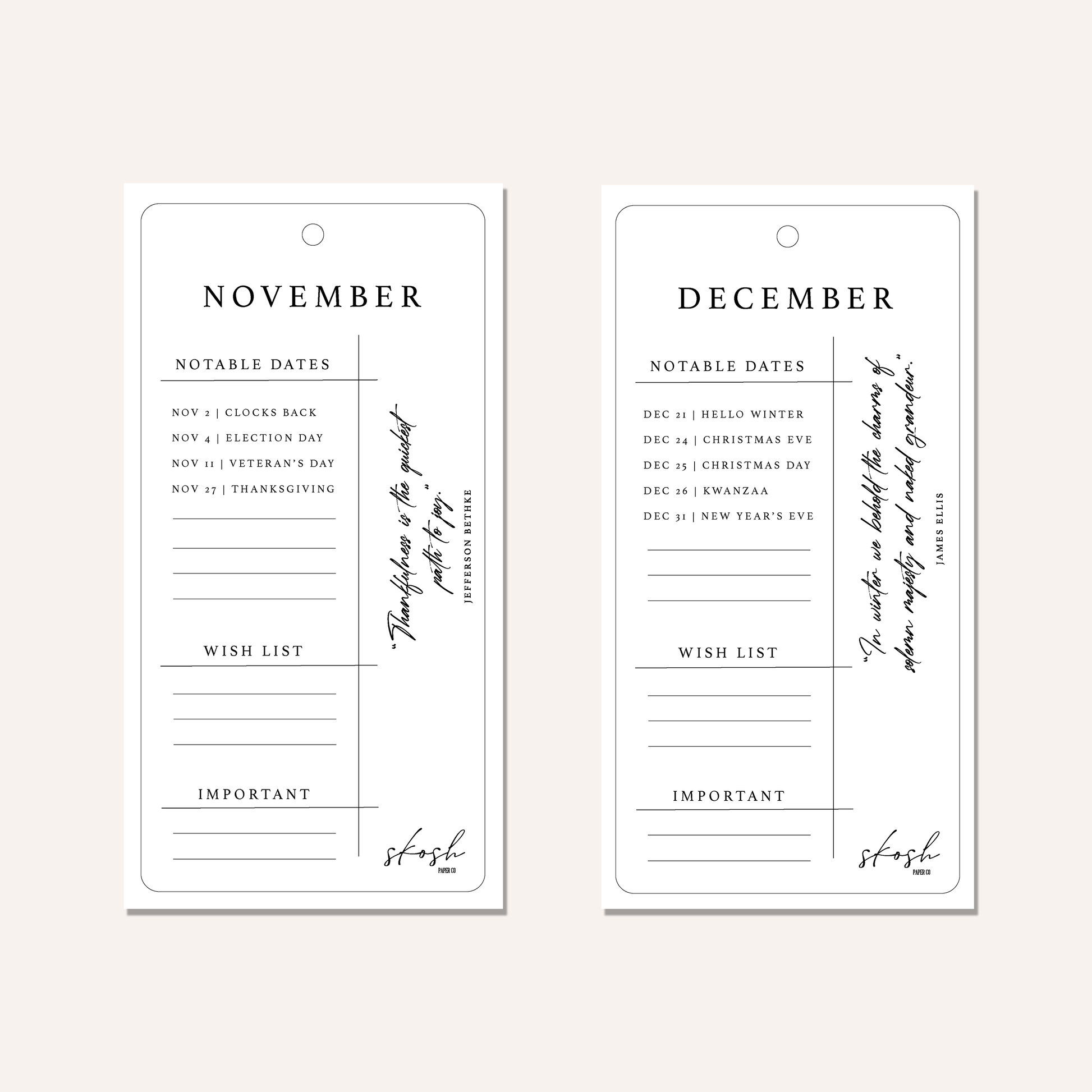 I wanted something for the front pocket of my planner—something useful, minimal, and beautiful. These monthly hang tags are the result. Designed to tuck into your planner pocket, each tag includes essential monthly info with space for personalization. Keep track of holidays, jot down important dates and wish list items, and add your own decorative touch.