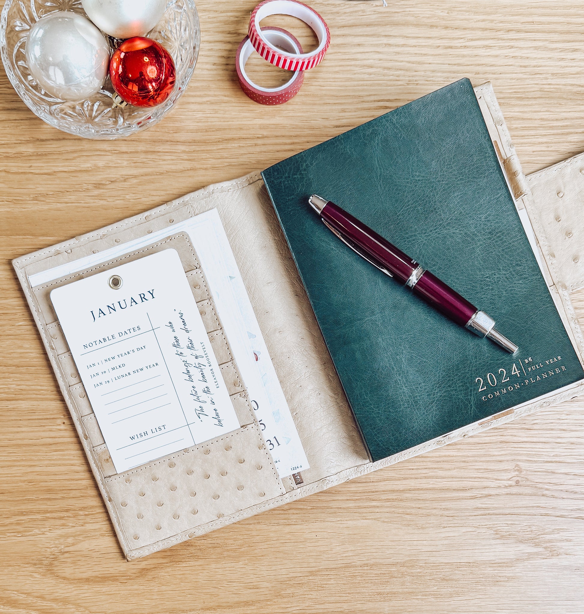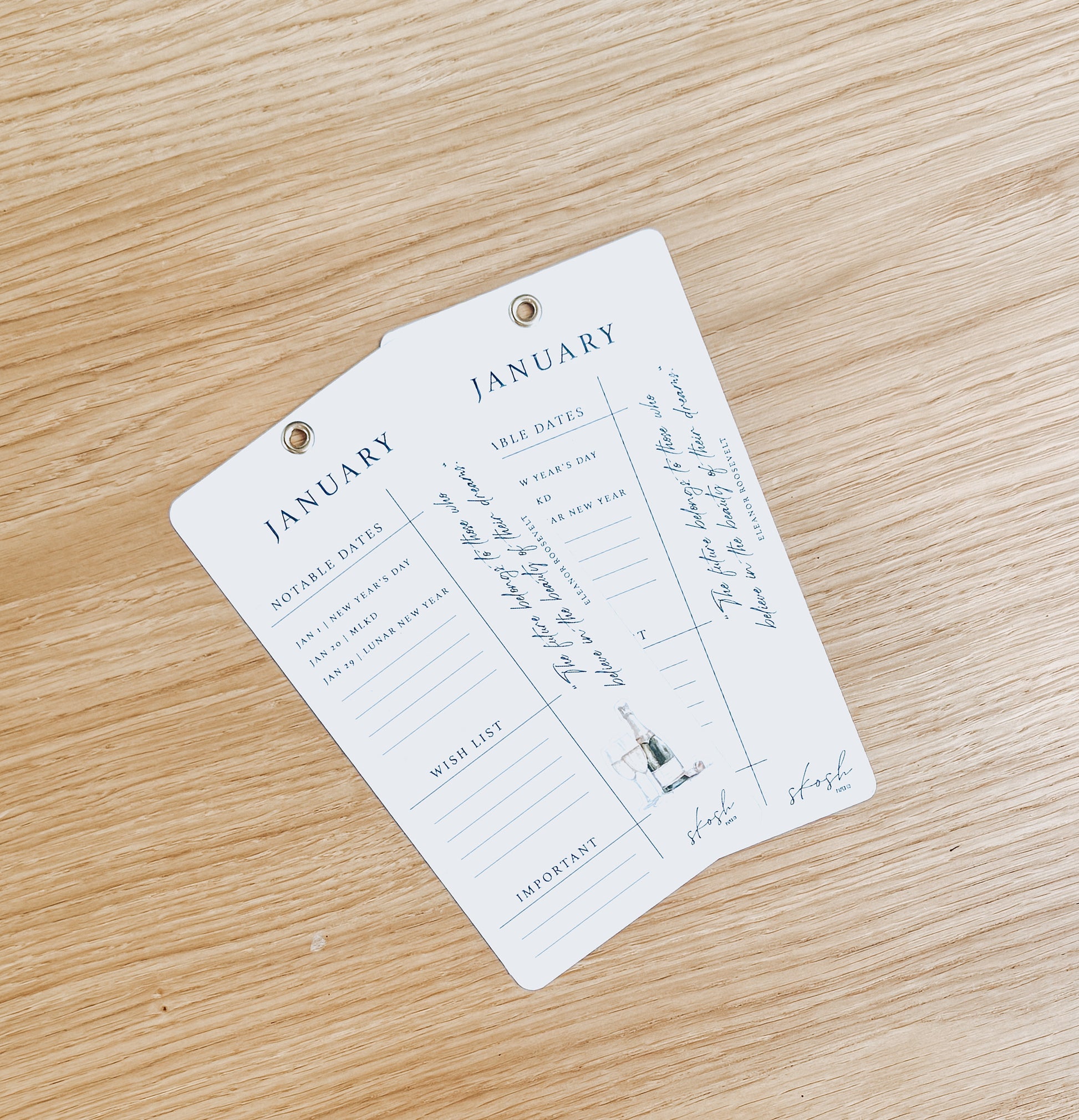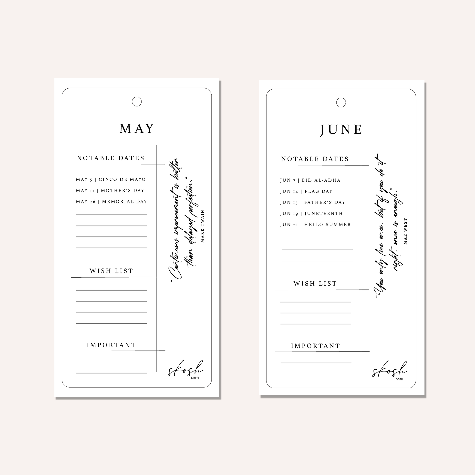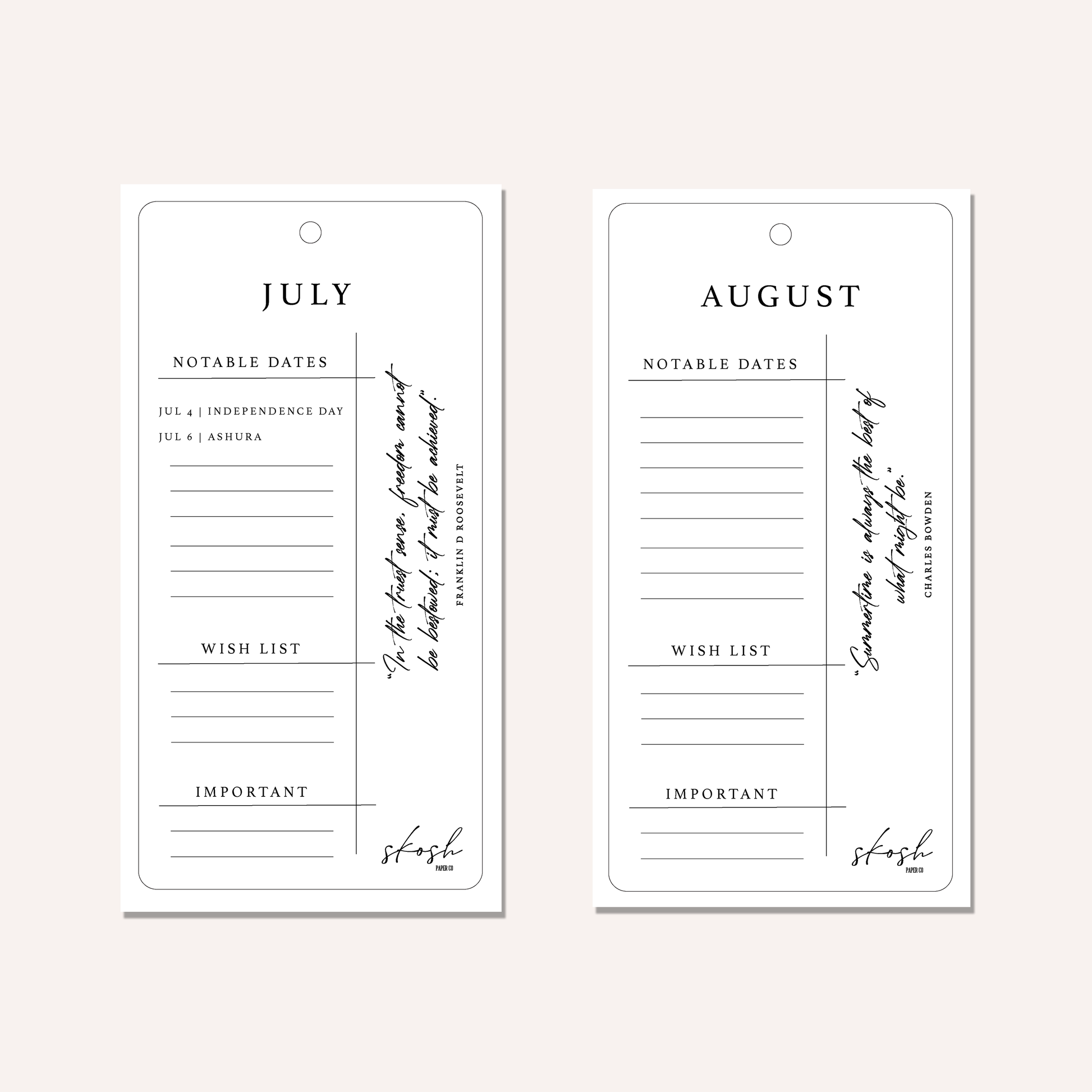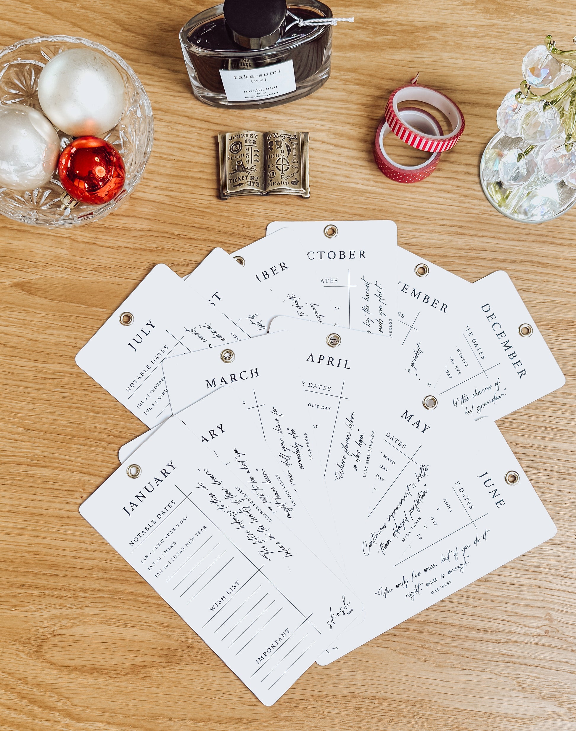 I wanted something for the front pocket of my planner—something useful, minimal, and beautiful. These monthly hang tags are the result. Designed to tuck into your planner pocket, each tag includes essential monthly info with space for personalization. Keep track of holidays, jot down important dates and wish list items, and add your own decorative touch.
